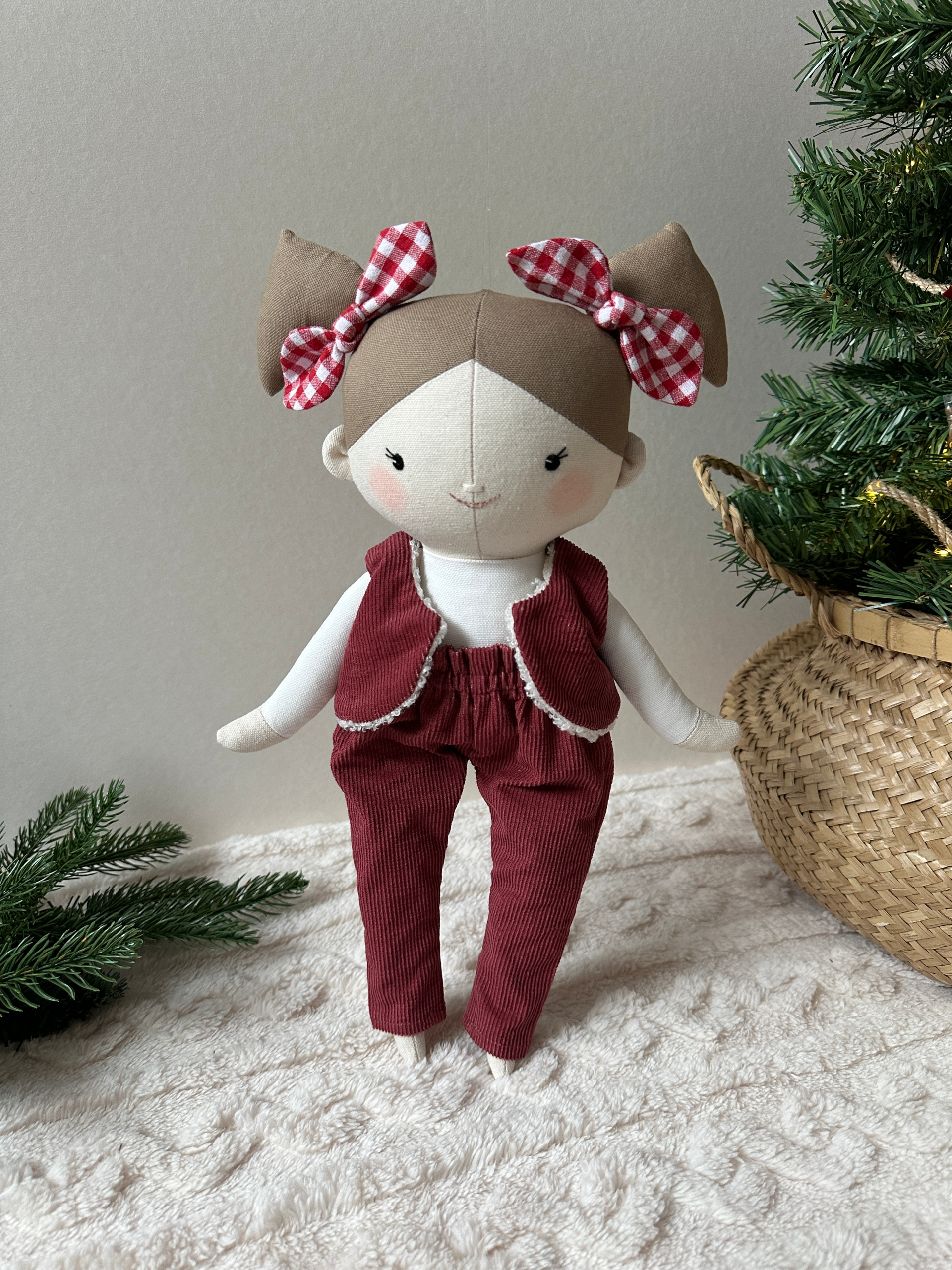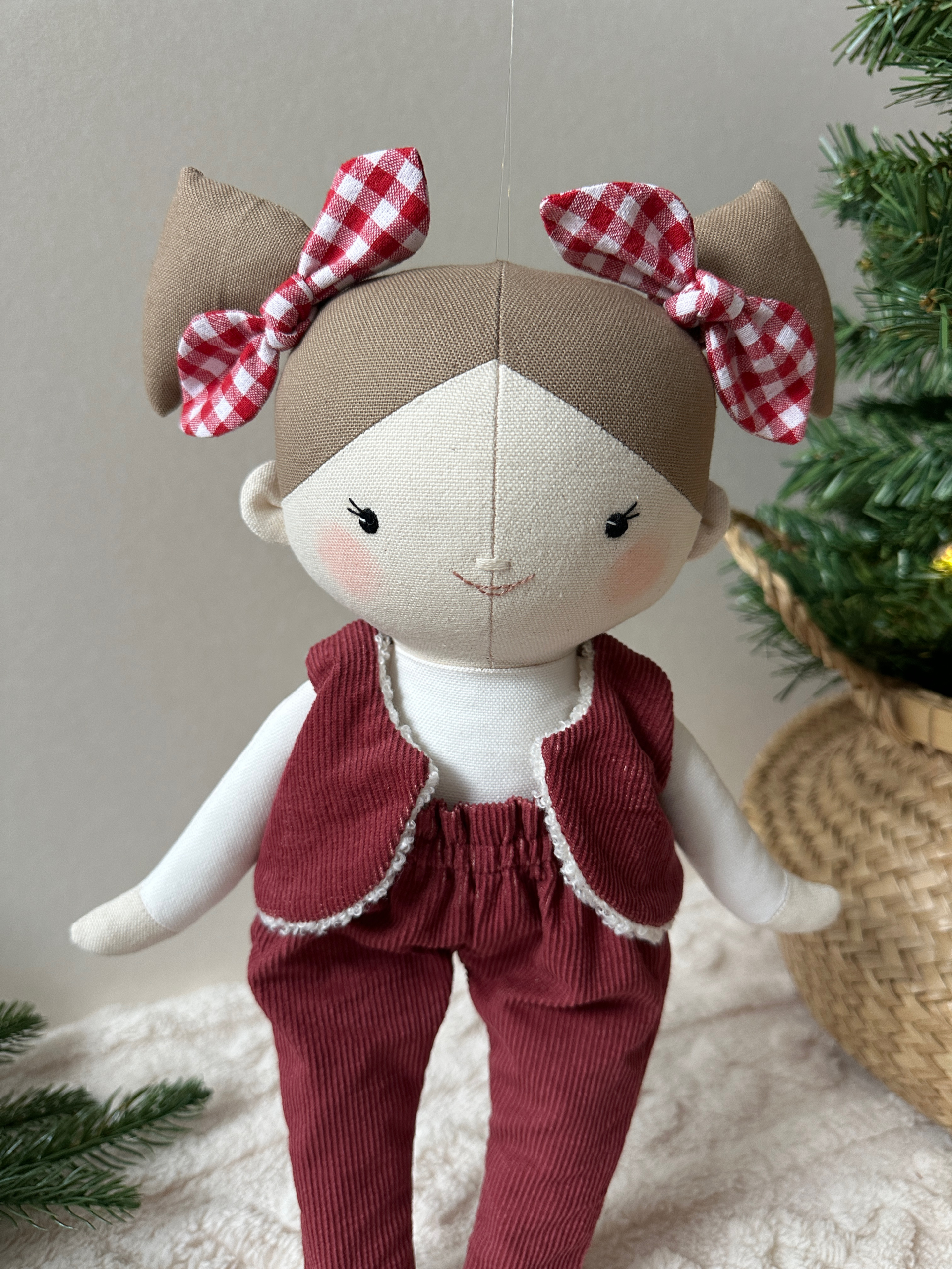 Egyedi, kézzel készült textil baba. Körülbelül 35 cm magas a lábfejétől a feje búbjáig. A teste kiváló minőségű pamutvászonból készült, és antiallergén szilikonizált poliészter golyóval van kitömve. Az arca kézzel hímzett.