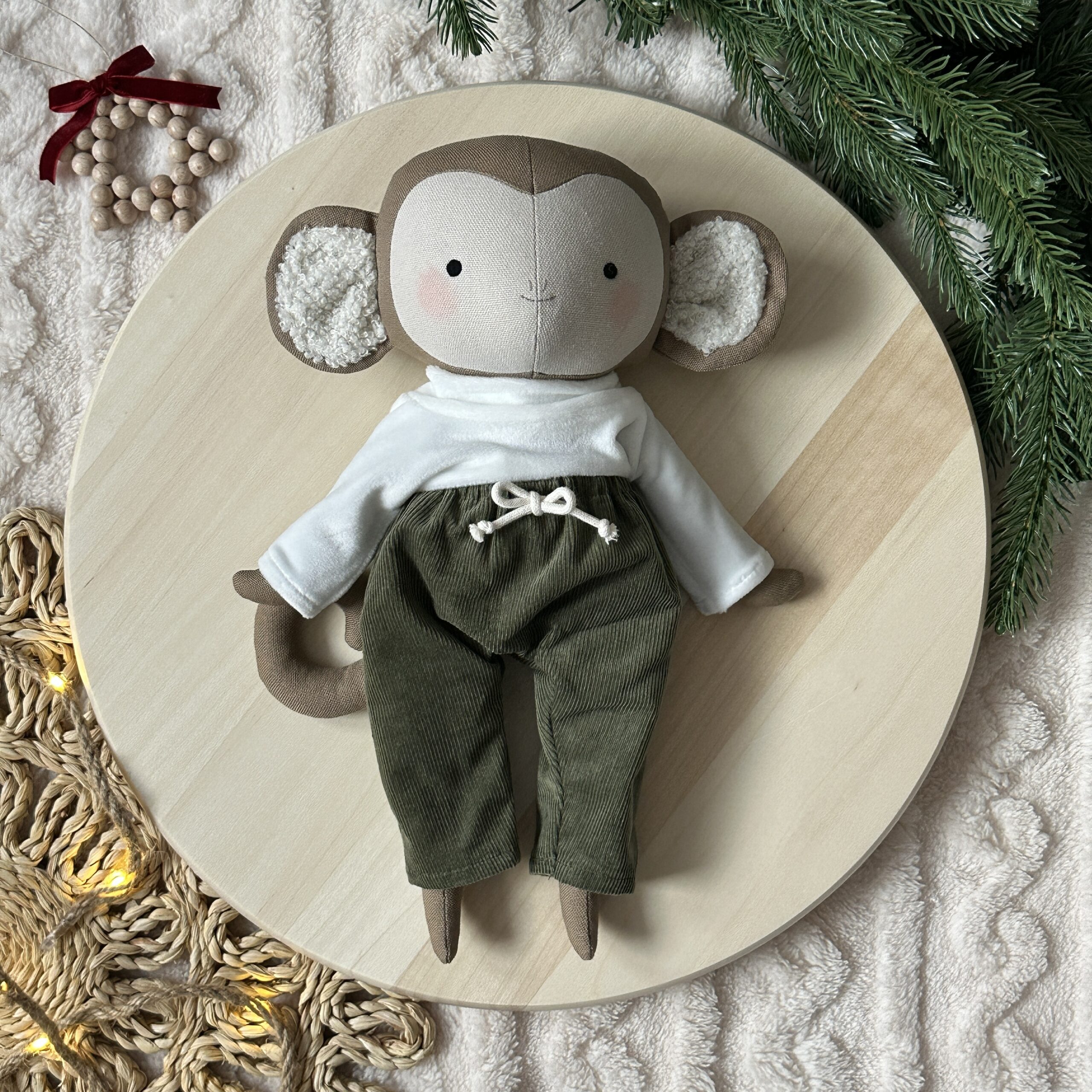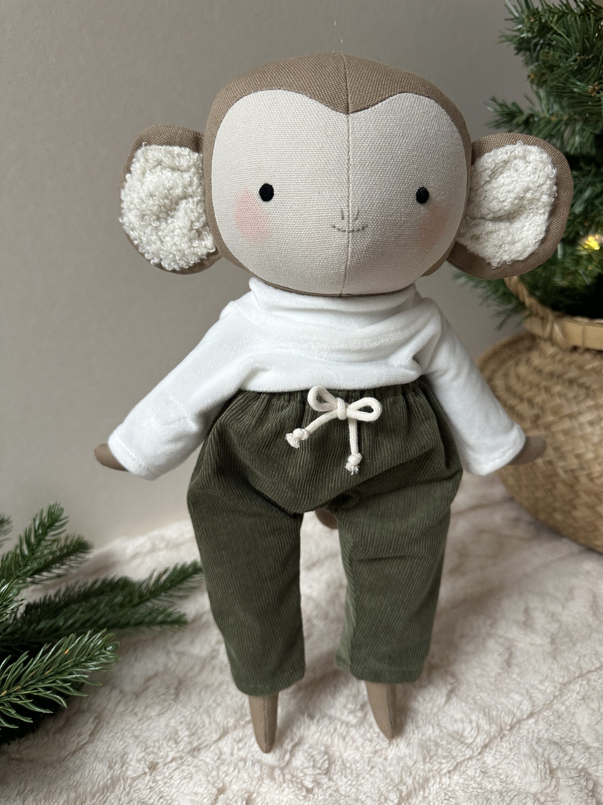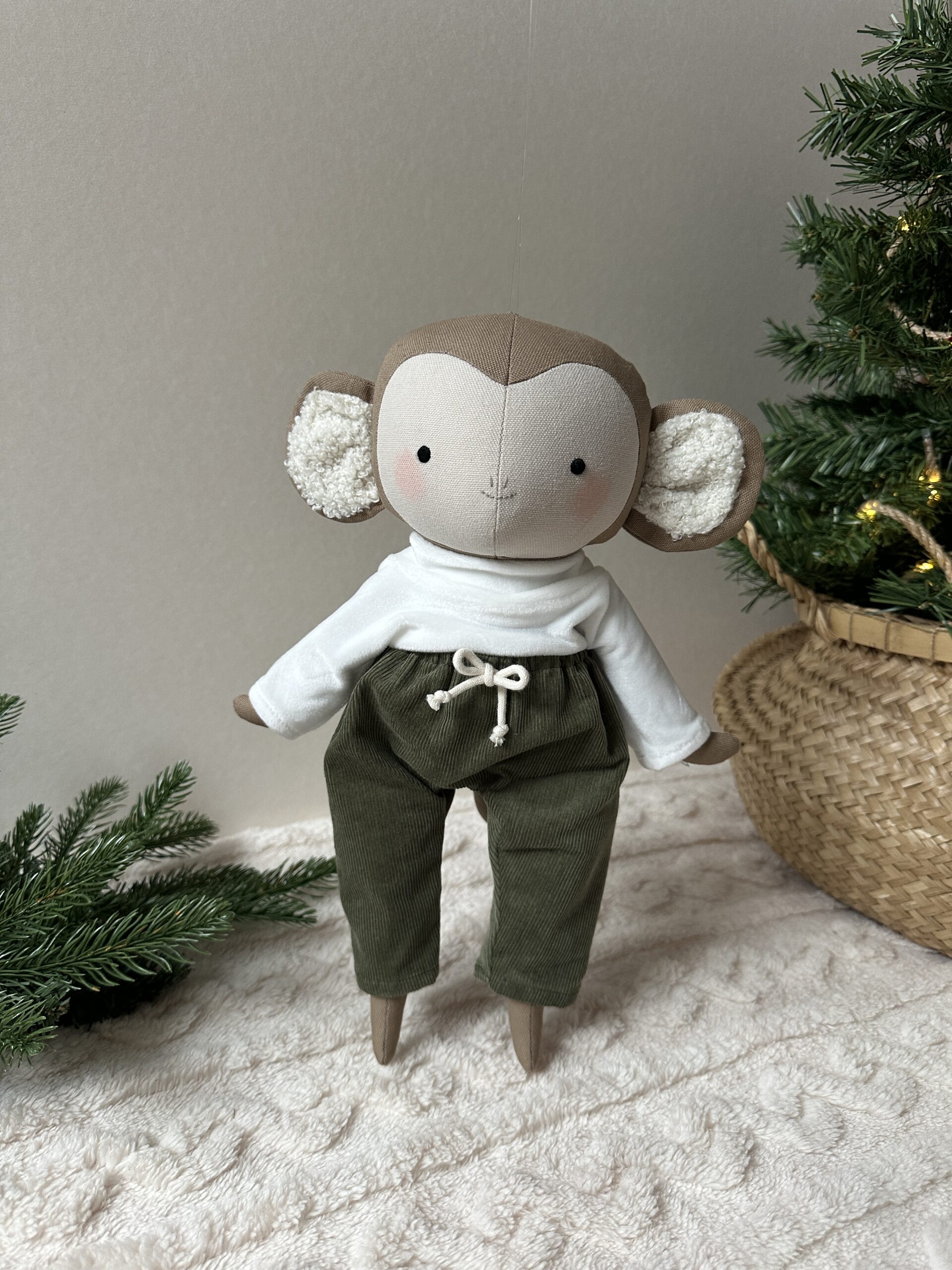 Egyedi, kézzel készült textil baba. Körülbelül 35 cm magas a lábfejétől a feje búbjáig. A teste kiváló minőségű pamutvászonból készült, és antiallergén szilikonizált poliészter golyóval van kitömve. Az arca kézzel hímzett.